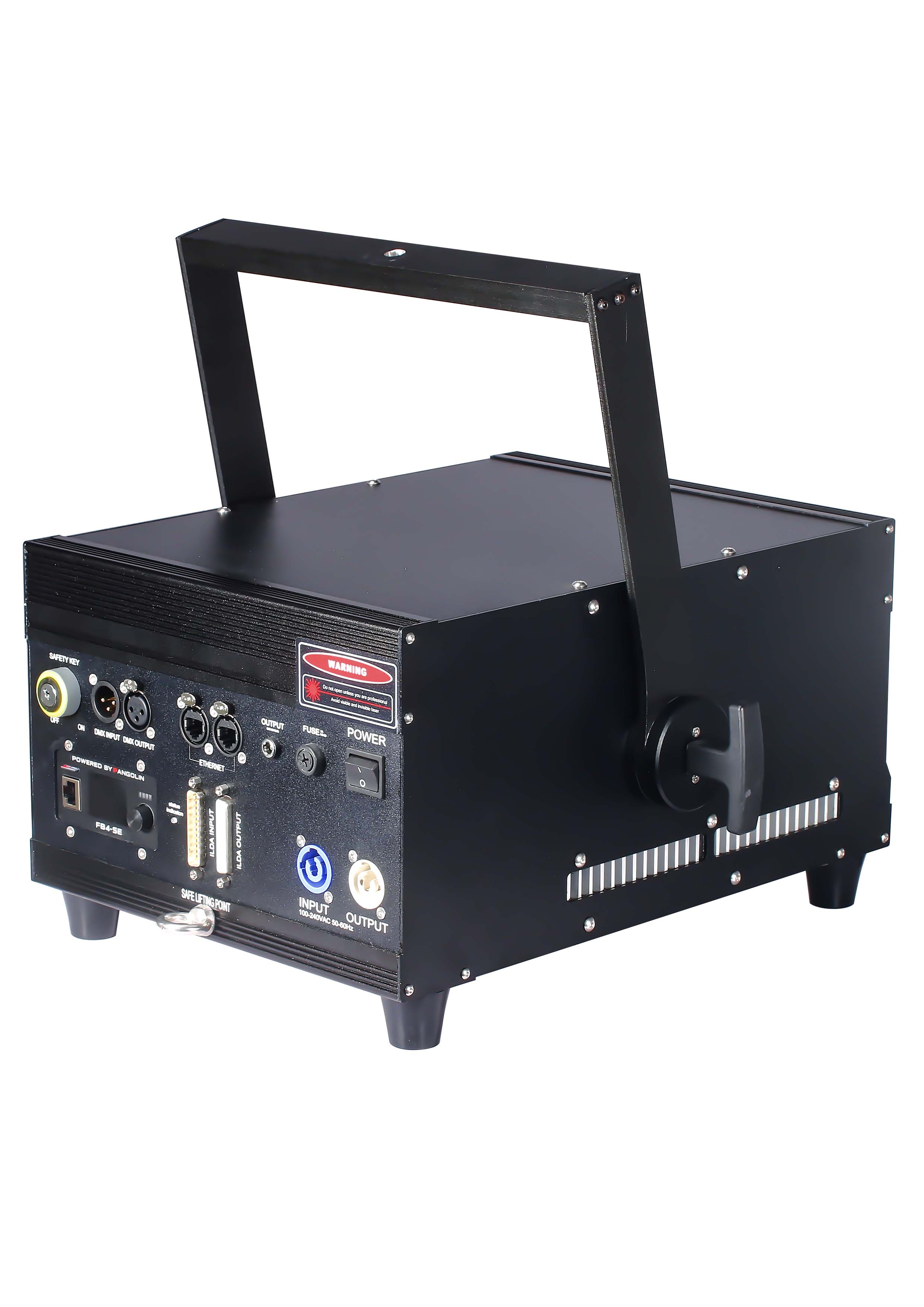 激光设备内部各板块分别配备独立电源供电提高电路稳定性。通过内置的 FB4 接口,CL12可提供多种控制选项,包括 ILDA、DMX以及通过Ethernet(以太网)进行的直接电脑控制(需使用 QuickShow 软件或 BEYOND 软件)。安全措施提供了欧标远程急停开关及物理光闸。