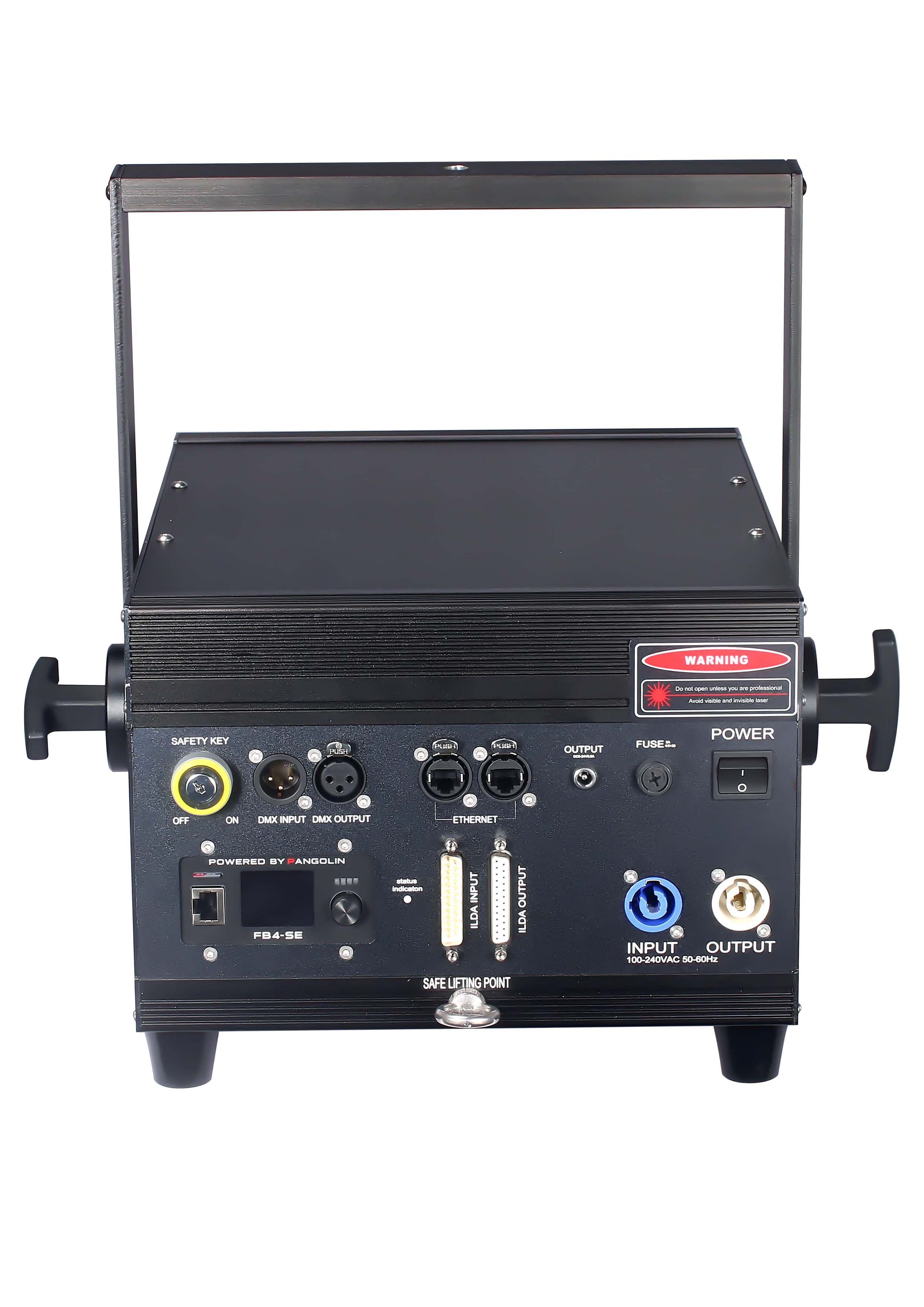 激光设备内部各板块分别配备独立电源供电提高电路稳定性。通过内置的 FB4 接口,CL12可提供多种控制选项,包括 ILDA、DMX以及通过Ethernet(以太网)进行的直接电脑控制(需使用 QuickShow 软件或 BEYOND 软件)。安全措施提供了欧标远程急停开关及物理光闸。