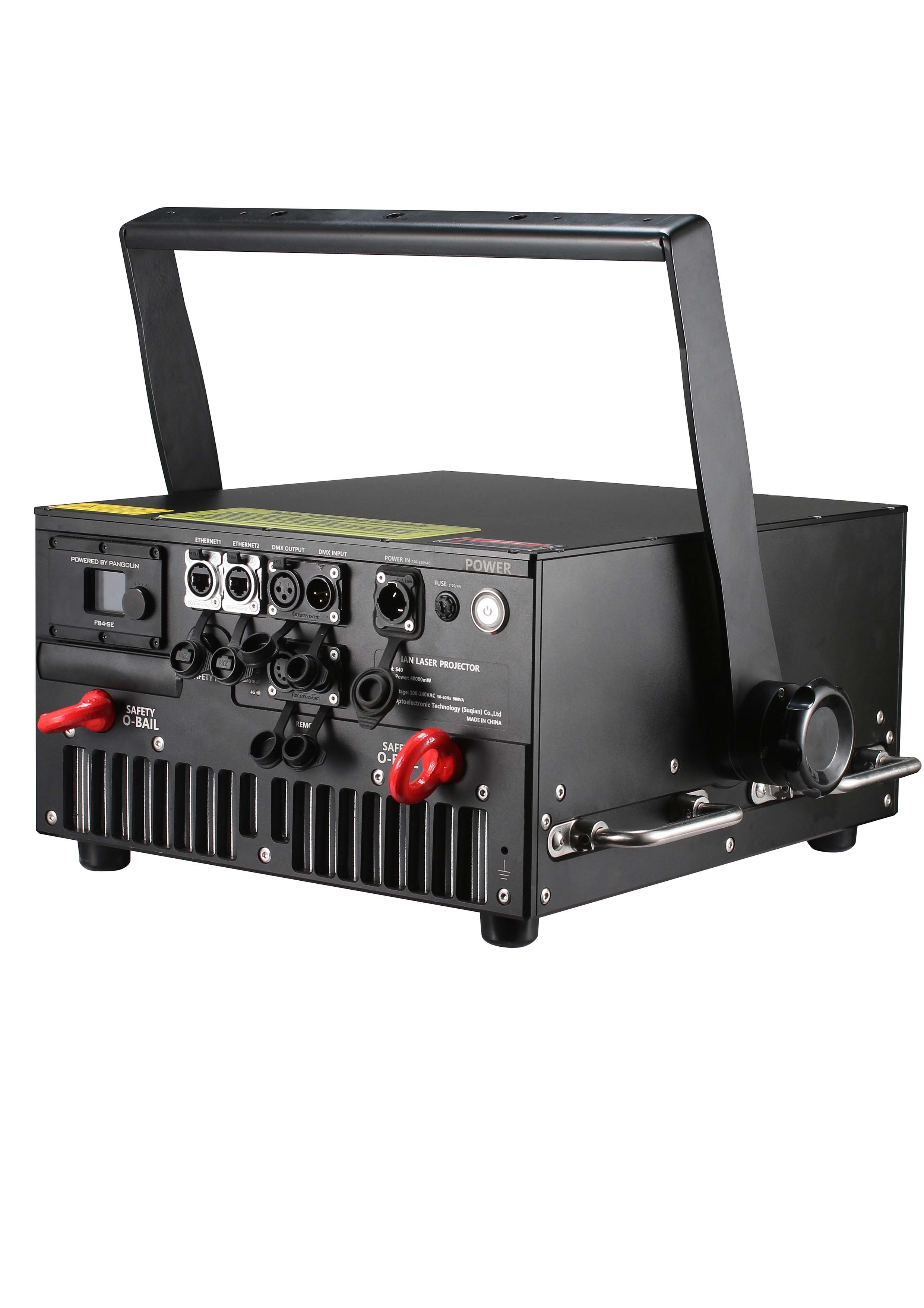 激光设备内部各板块分别配备独立电源供电提高电路稳定性。通过内置的 FB4 接口,S33可提供多种控制选项,包括 ILDA、DMX以及通过Ethernet(以太网)进行的直接电脑控制(需使用 QuickShow 软件或 BEYOND 软件)。安全措施提供了欧标远程急停开关及物理光闸。