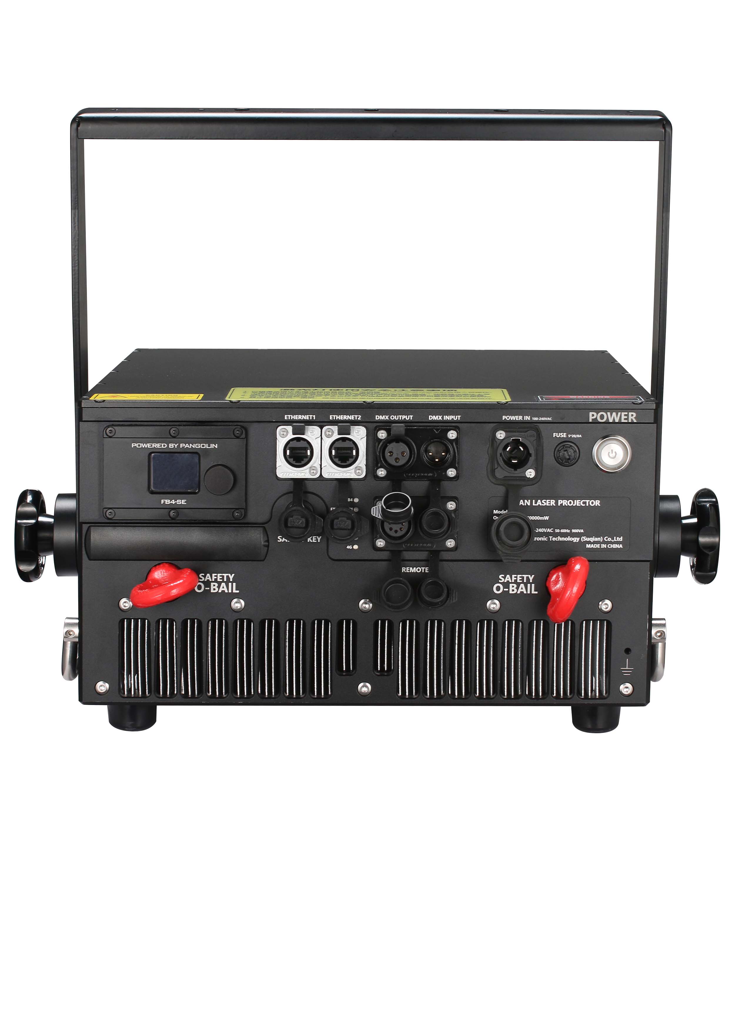 激光设备内部各板块分别配备独立电源供电提高电路稳定性。通过内置的 FB4 接口,S28可提供多种控制选项,包括 ILDA、DMX以及通过Ethernet(以太网)进行的直接电脑控制(需使用 QuickShow 软件或 BEYOND 软件)。安全措施提供了欧标远程急停开关及物理光闸。